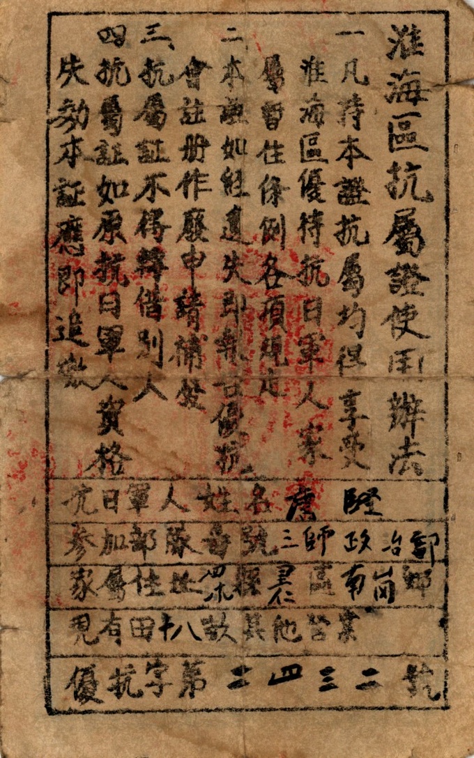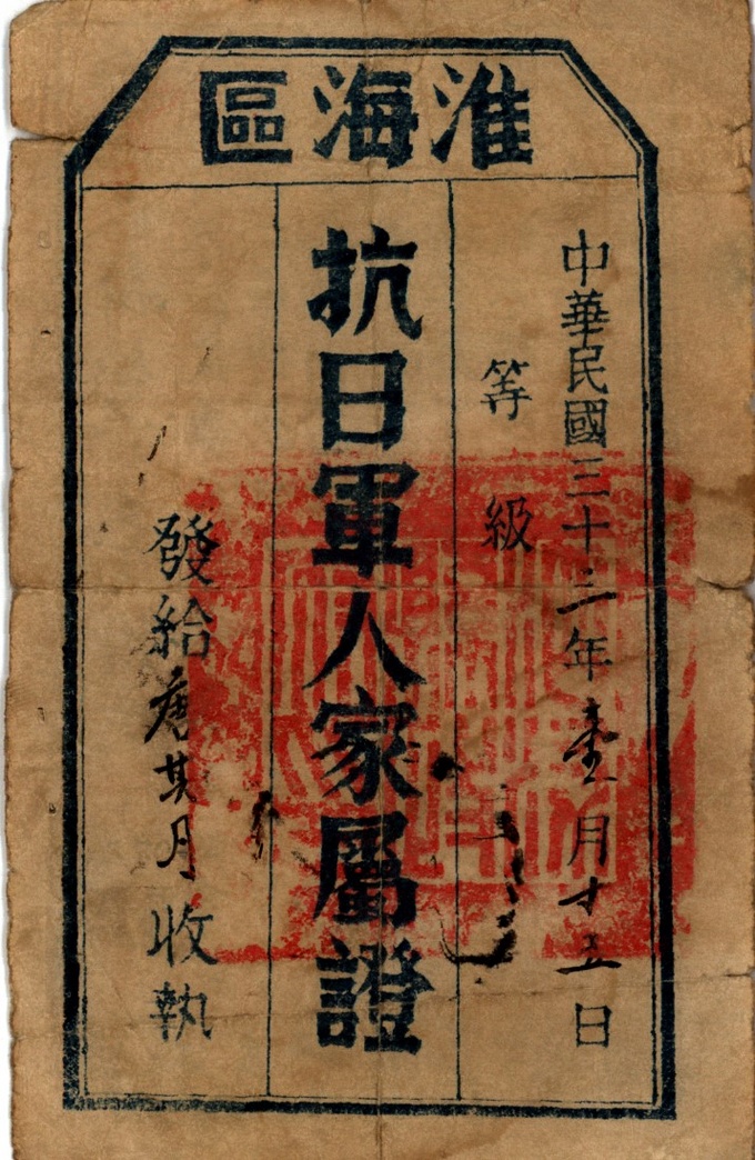 ▲《抗日军人家属证》(江苏省宿迁市泗阳县档案馆馆藏)